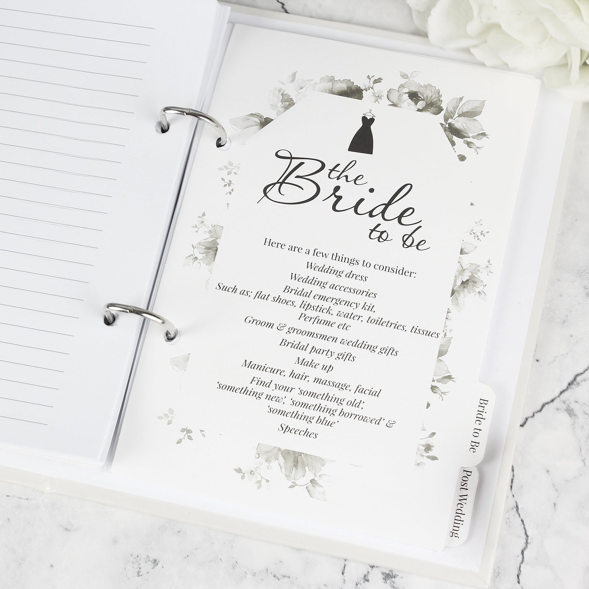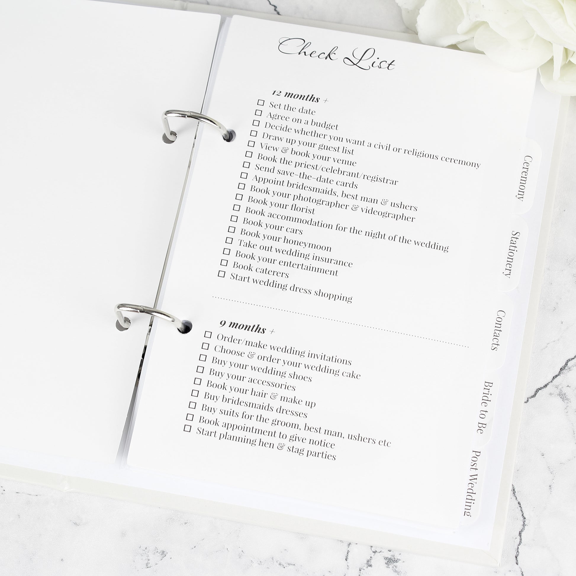 This ring-bound wedding planner includes sections for the ceremony, stationery, contacts, Bride to be and post wedding.