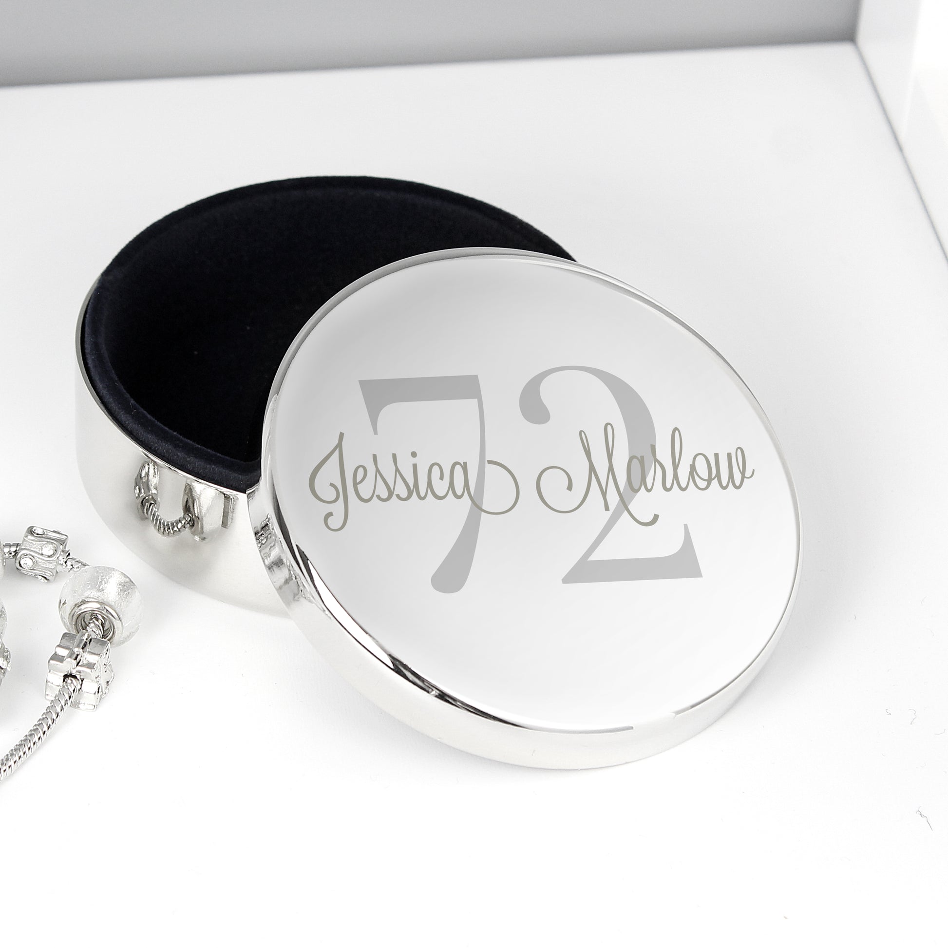 The Personalised Big Age Round Trinket Box can be personalised with a name up to 15 characters followed by an age up to 2 characters in length.