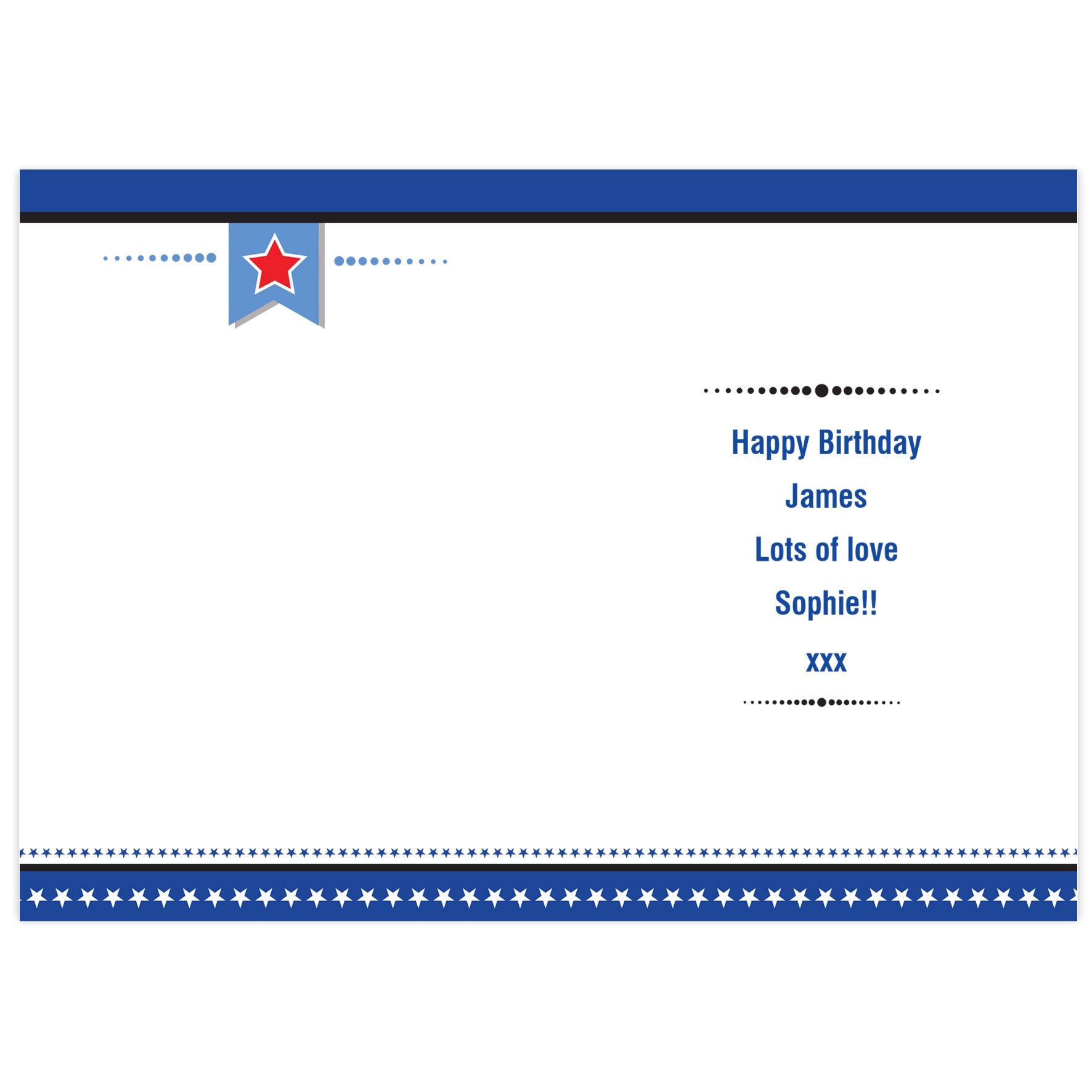 Personalise this Birthday Star card with an age up to 2 characters, followed by 2 lines of up to 20 characters each on the front of the card. The inside of this card can also be personalised with 4 lines of up to 20 characters each.