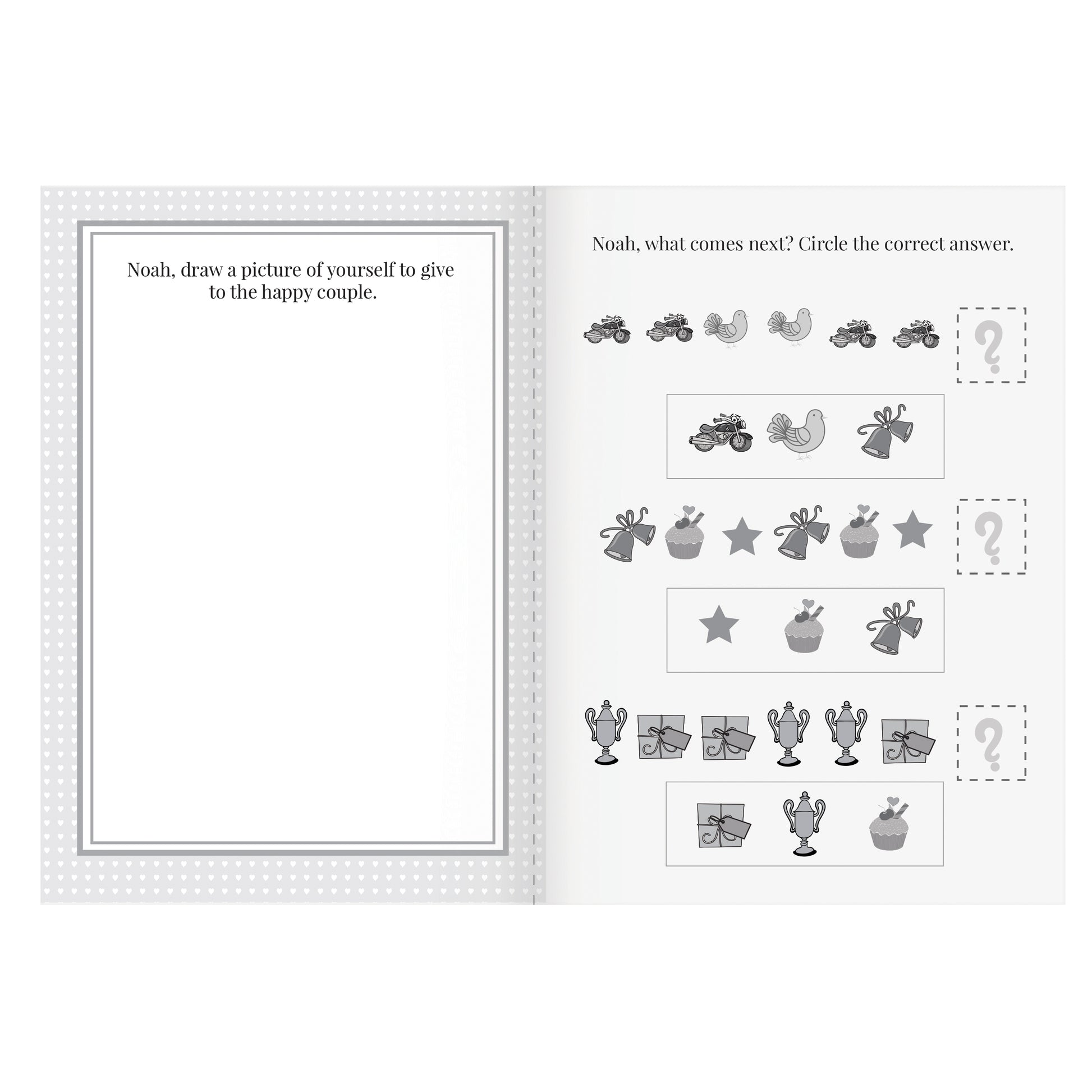 Personalise the front of this activity book with a name up to 12 characters (this will appear on every page of the book) and then a message over 2 lines of up to 20 characters per line. The words 'Wedding Activity Book For' are fixed. You can then personalise the inside with a message over 4 lines up to 20 characters per line.