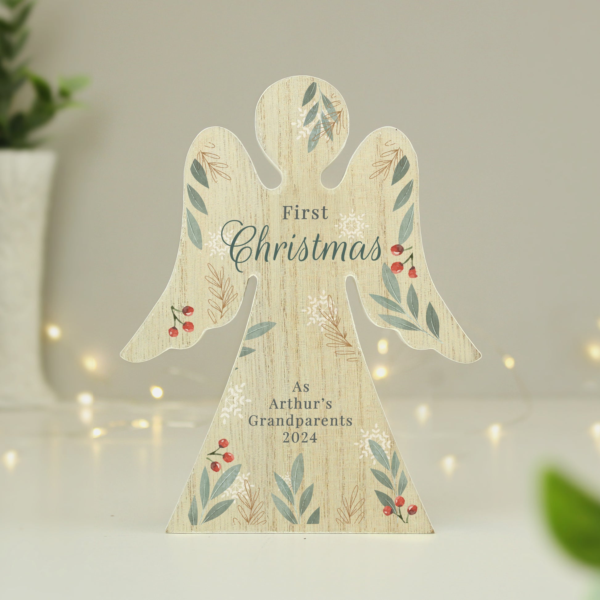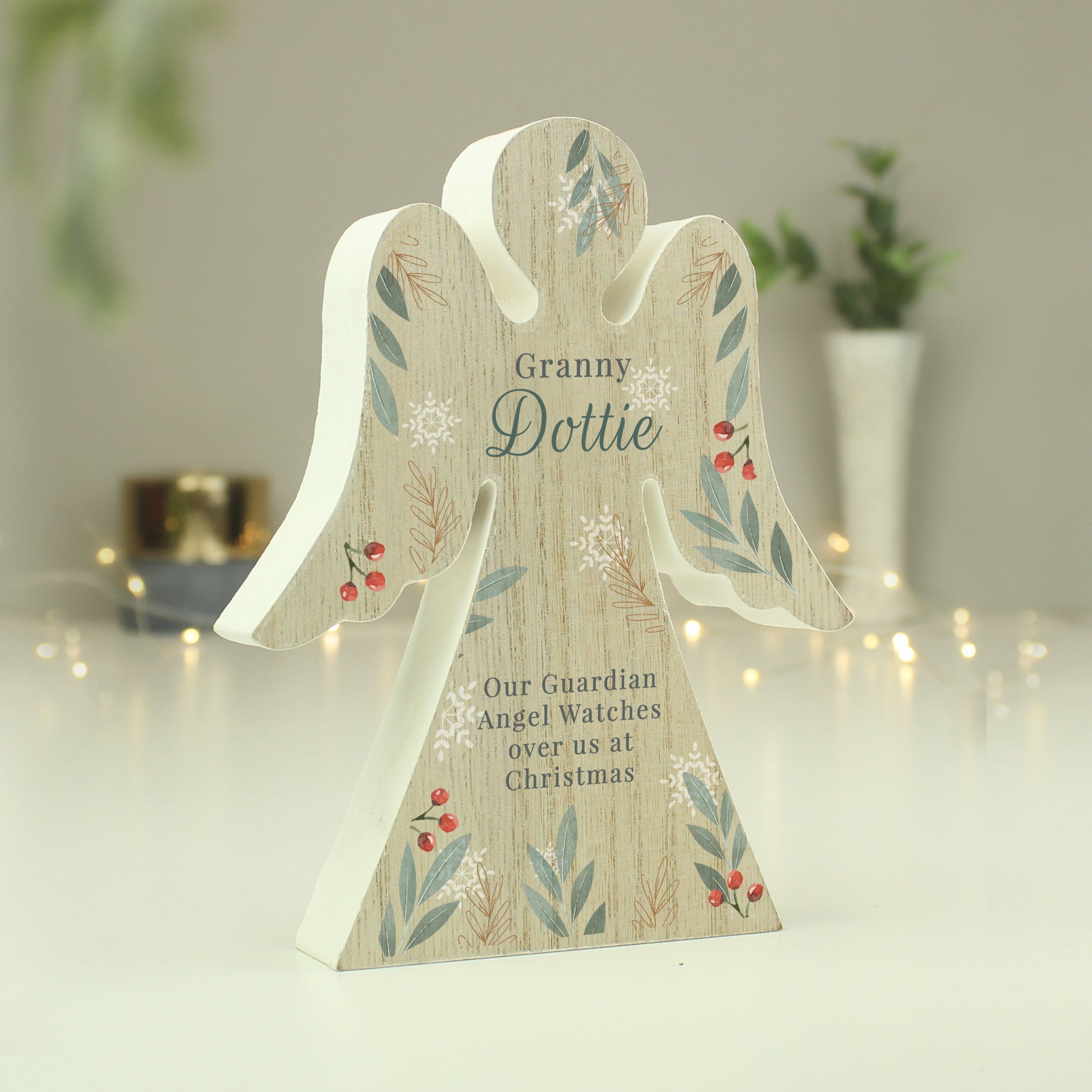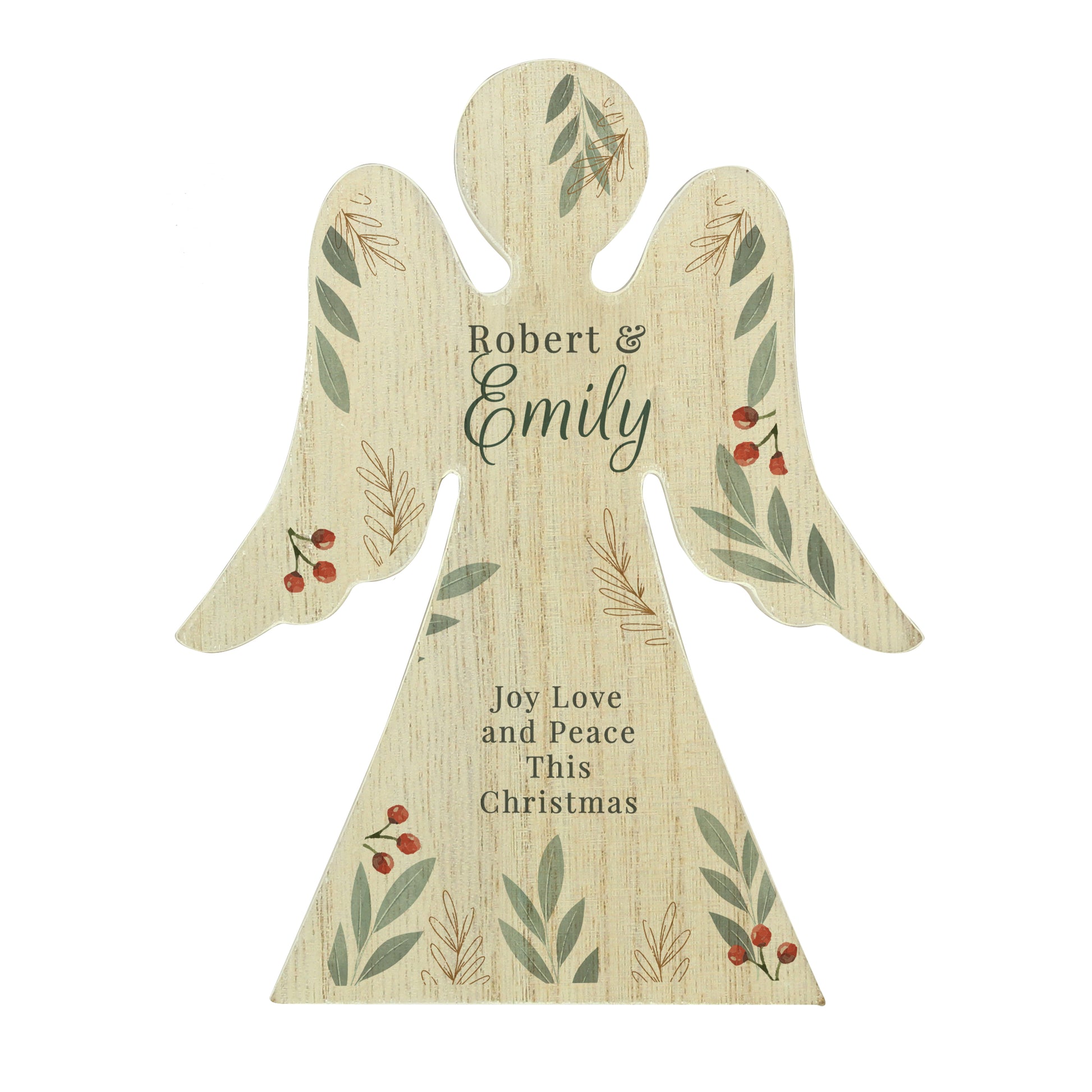 Crafted from high-quality wood, this charming ornament features a beautifully detailed angel adorned with festive foliage accents, embodying the spirit of Christmas.