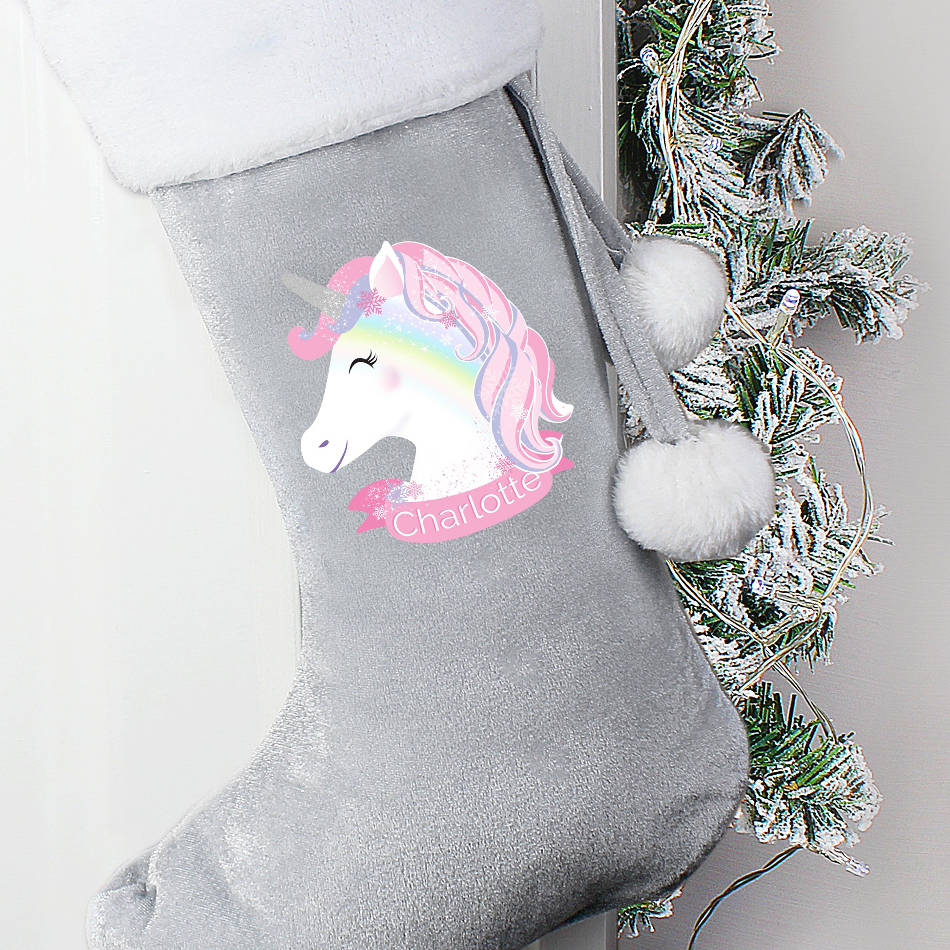 Personalised Christmas Unicorn Luxury Silver Grey Stocking