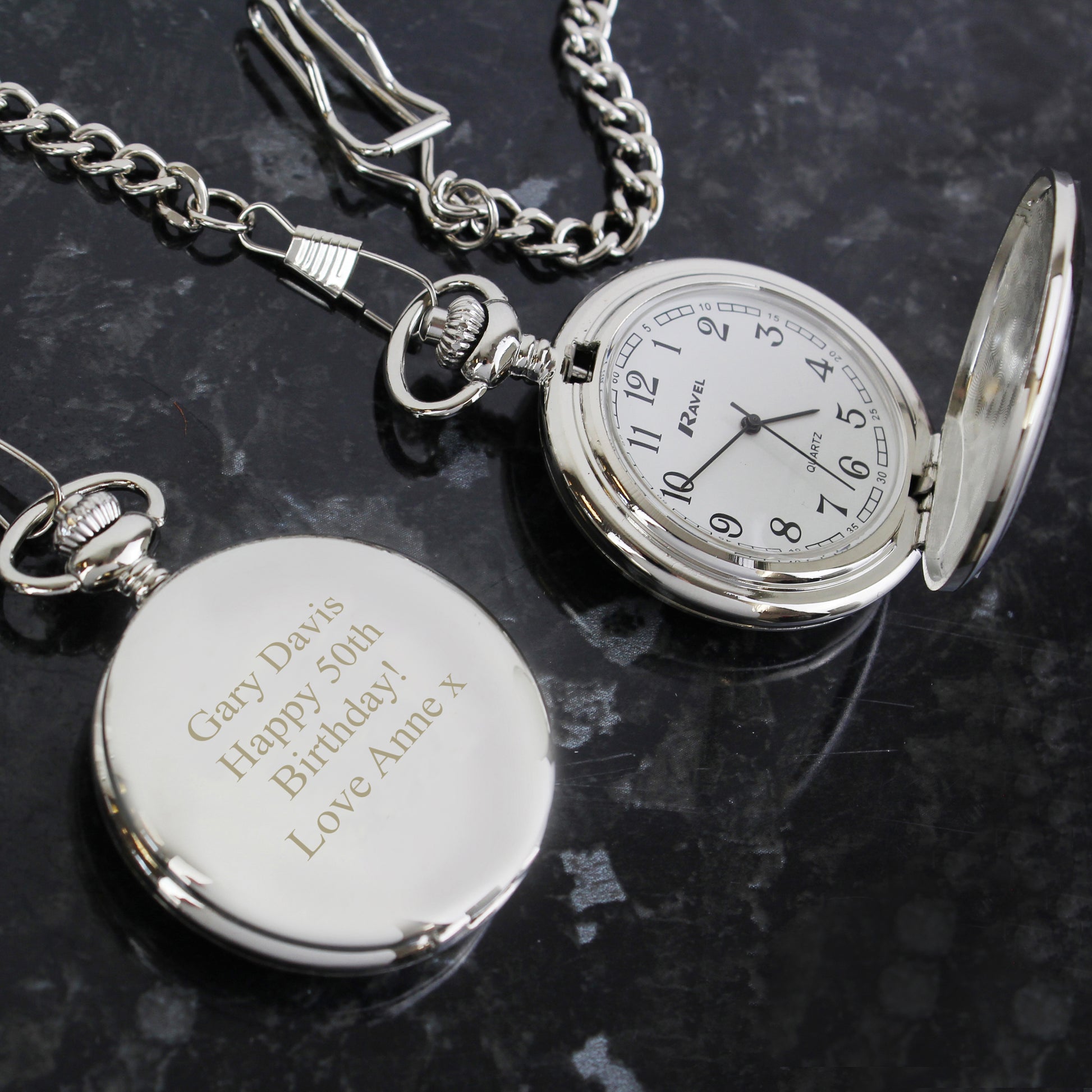 The pocket fob watch can be personalised with a message over 4 lines of text, with up to 15 characters per line.
