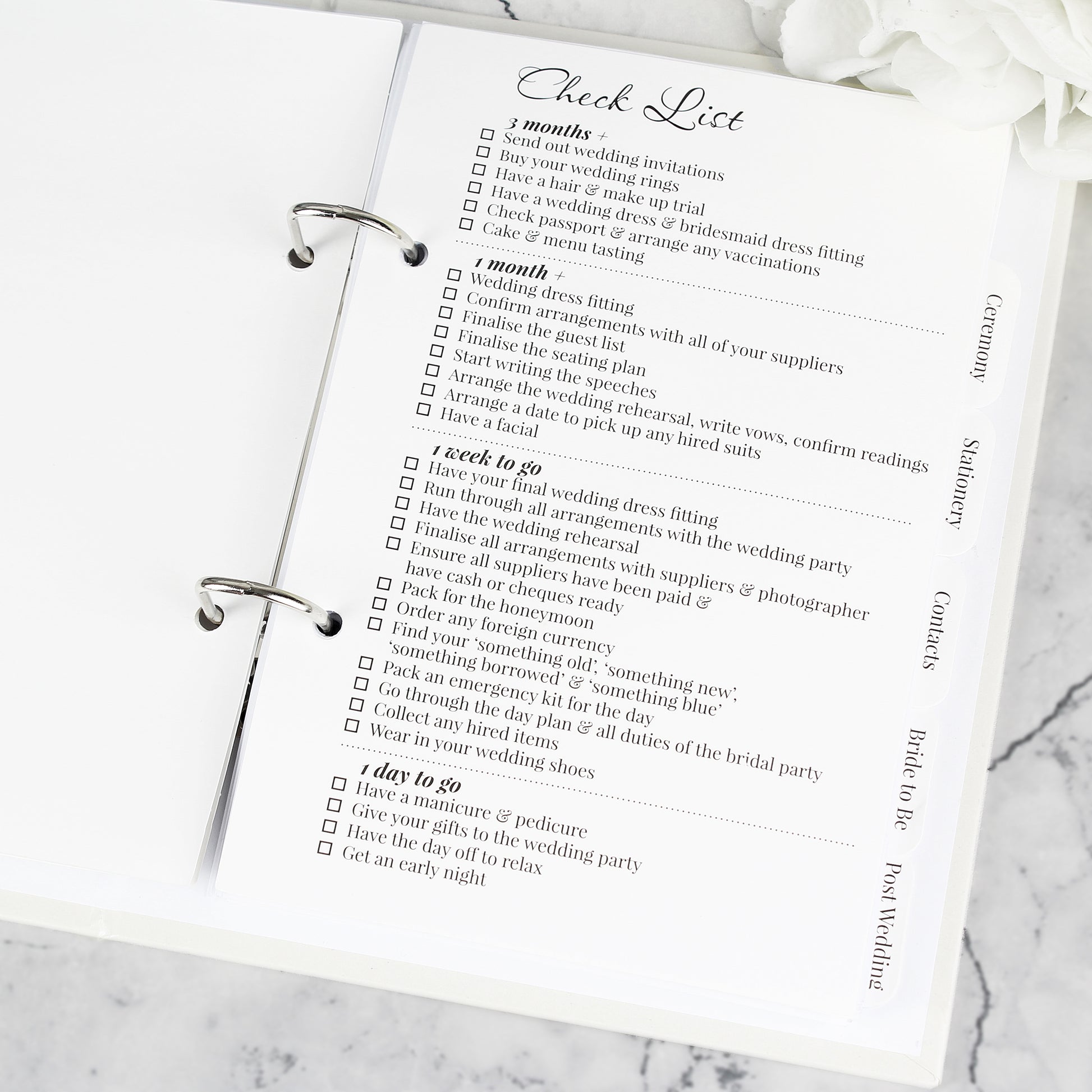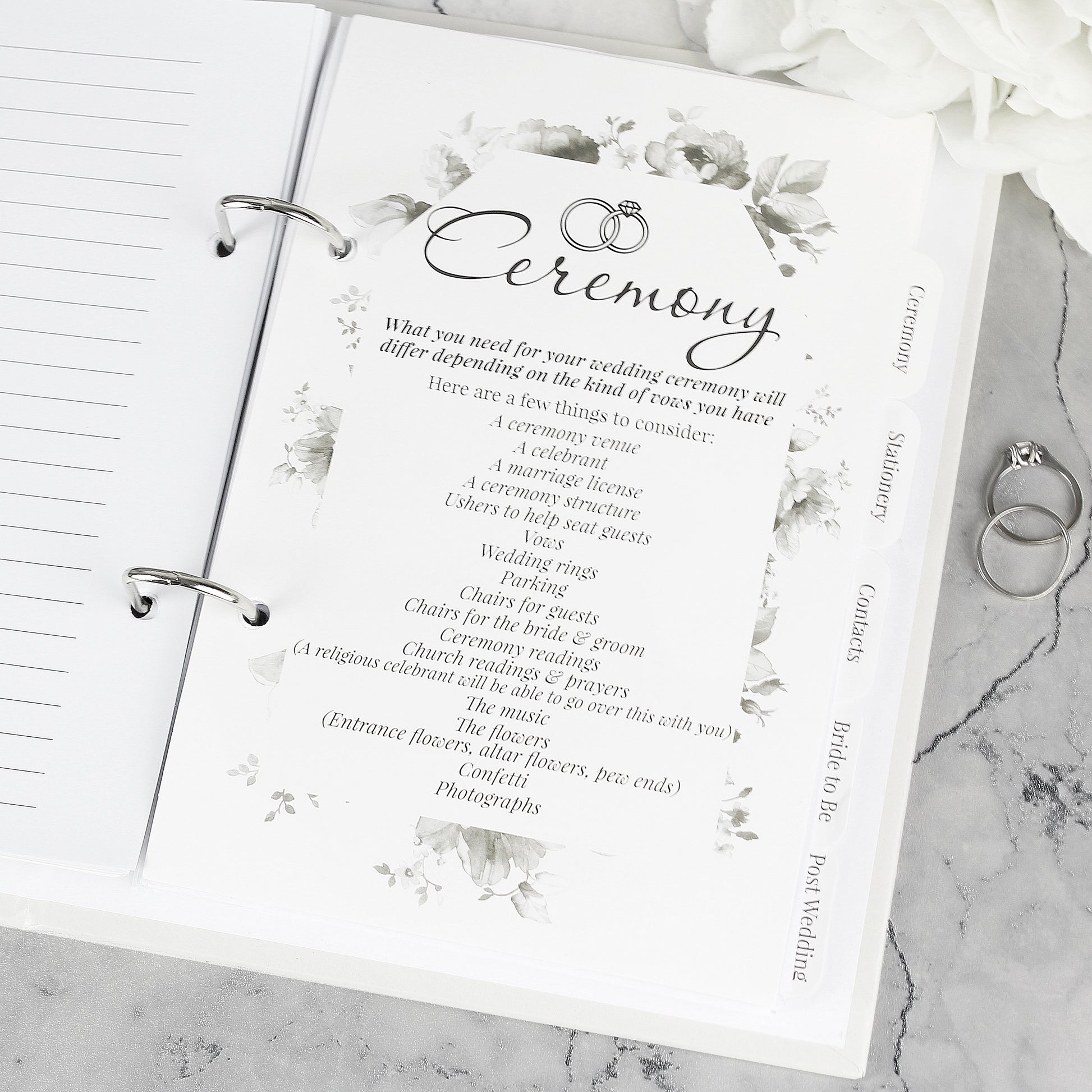 This ring-bound wedding planner includes sections for the ceremony, stationery, contacts, Bride to be and post wedding.