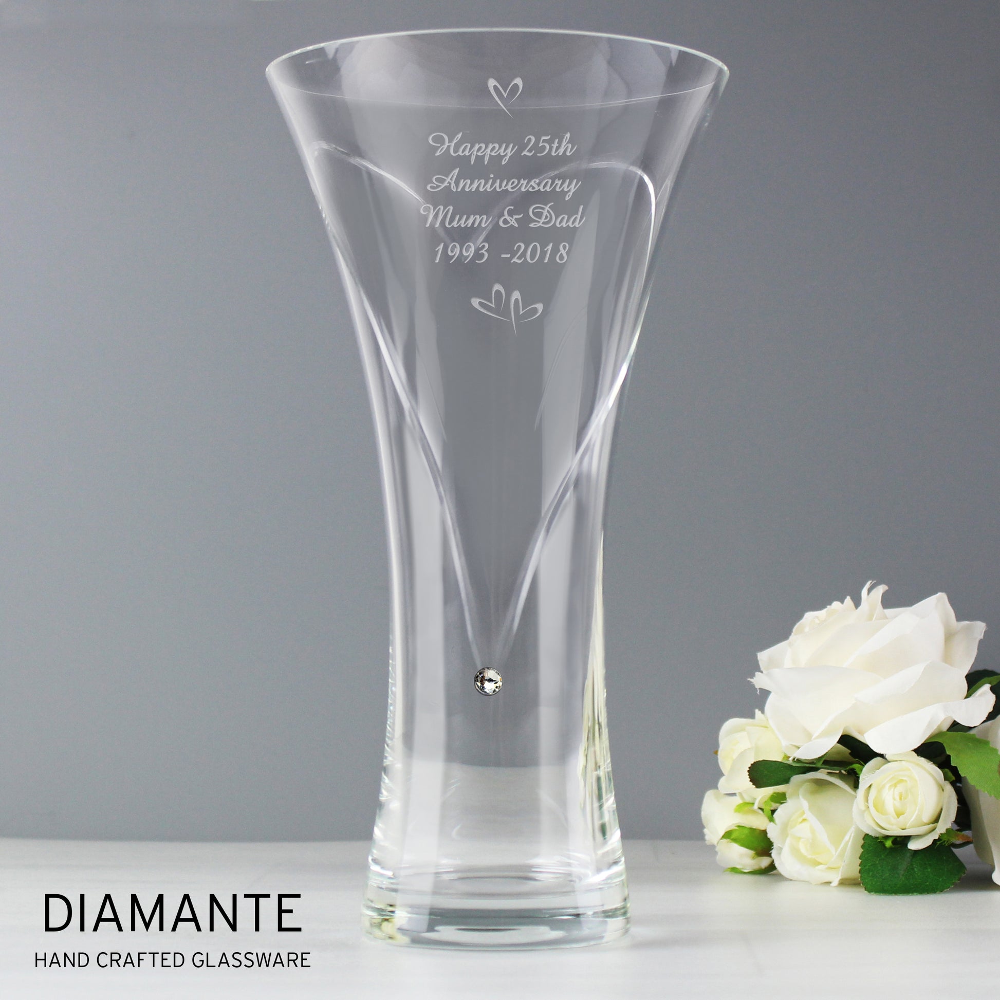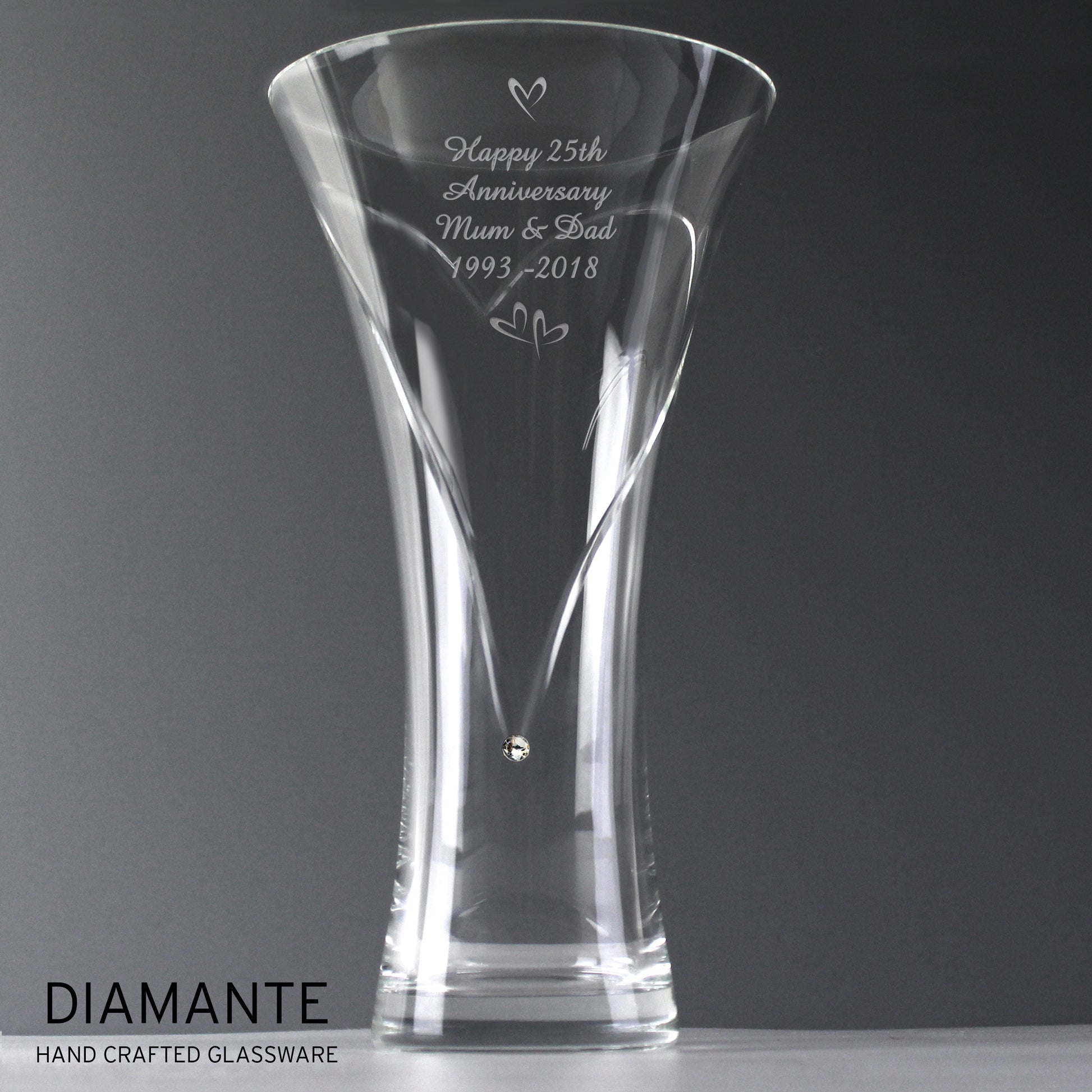 This diamante vase features a cut heart swirl design. It also features a small hearts design underneath the personalisation.