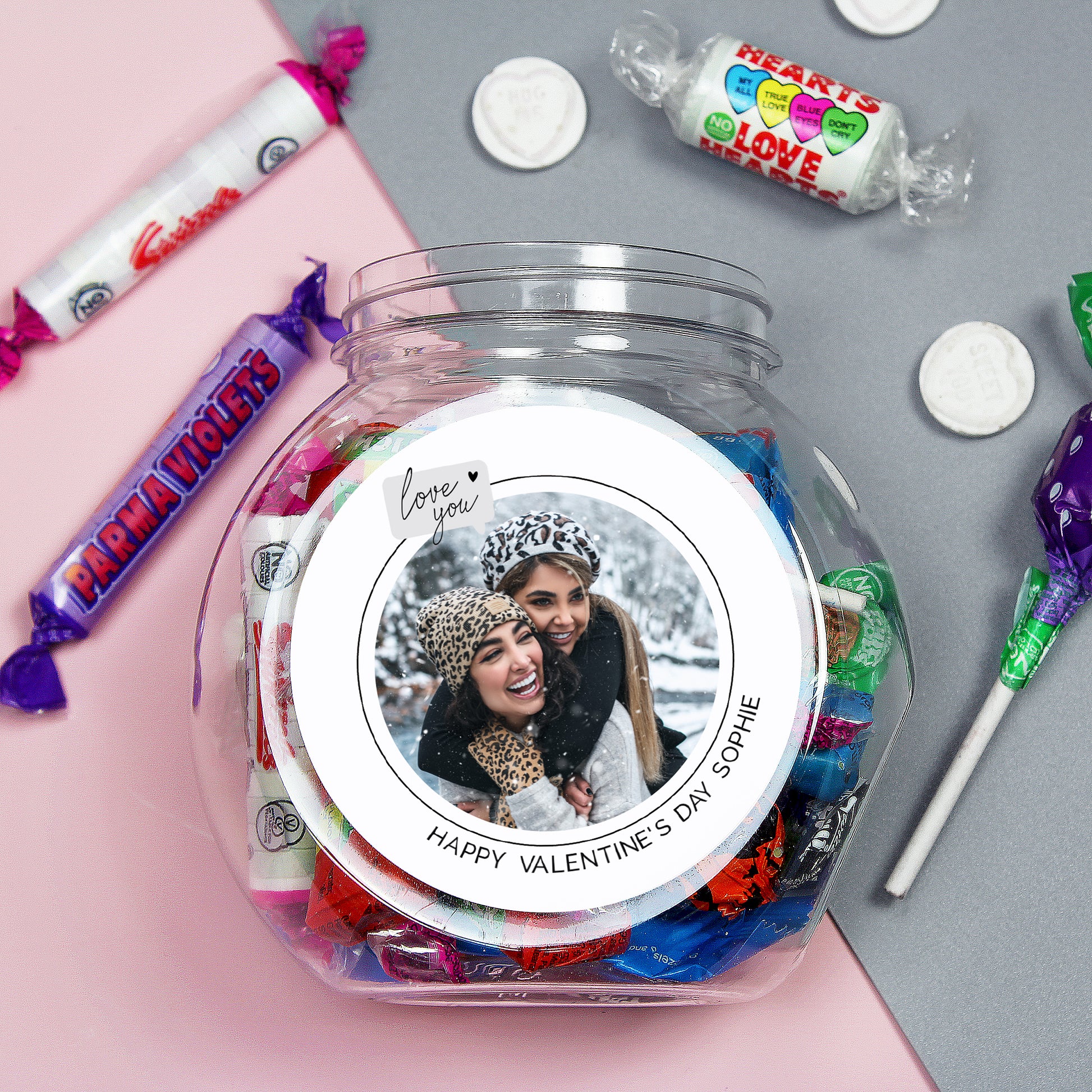This jar of yummy sweets can be personalised with your own photo plus your own message below.