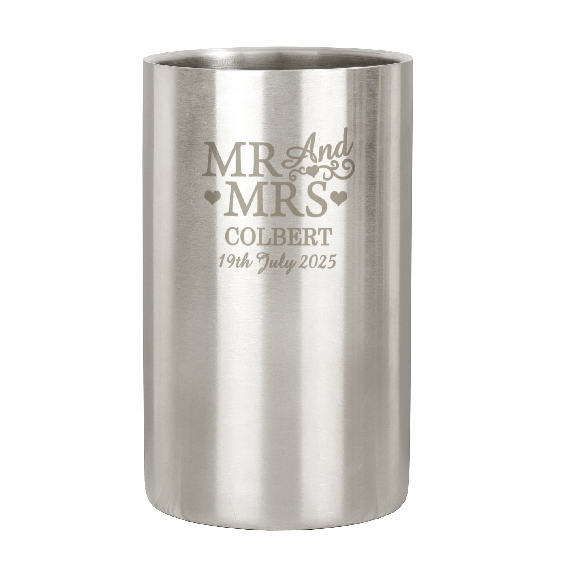Personalise this Mr & Mrs Stainless Steel Wine Cooler with a surname up to 15 characters and date up to 20 characters.