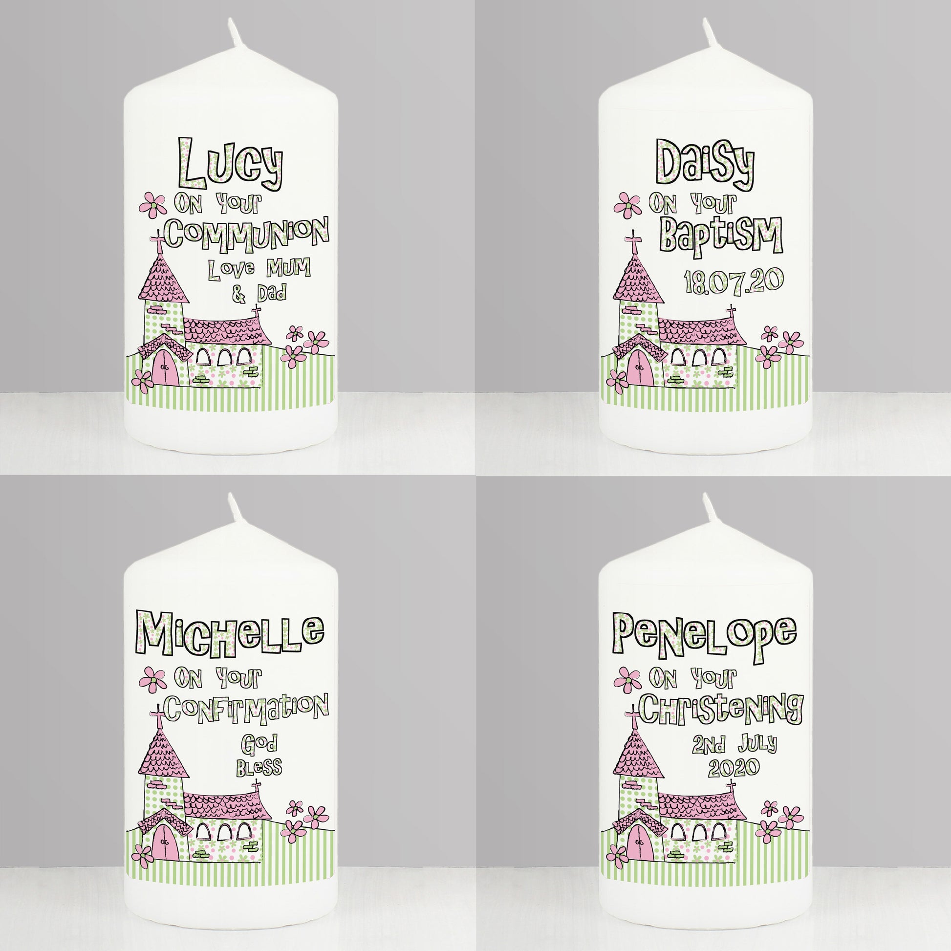 This pretty white candle makes the perfect keepsake for that special occasion. The candle itself features a pretty church design and can be personalised with a first name of up to 15 characters any occasion such as christening up to 12 character and also a date up to 20 characters. (On Your is standard text).