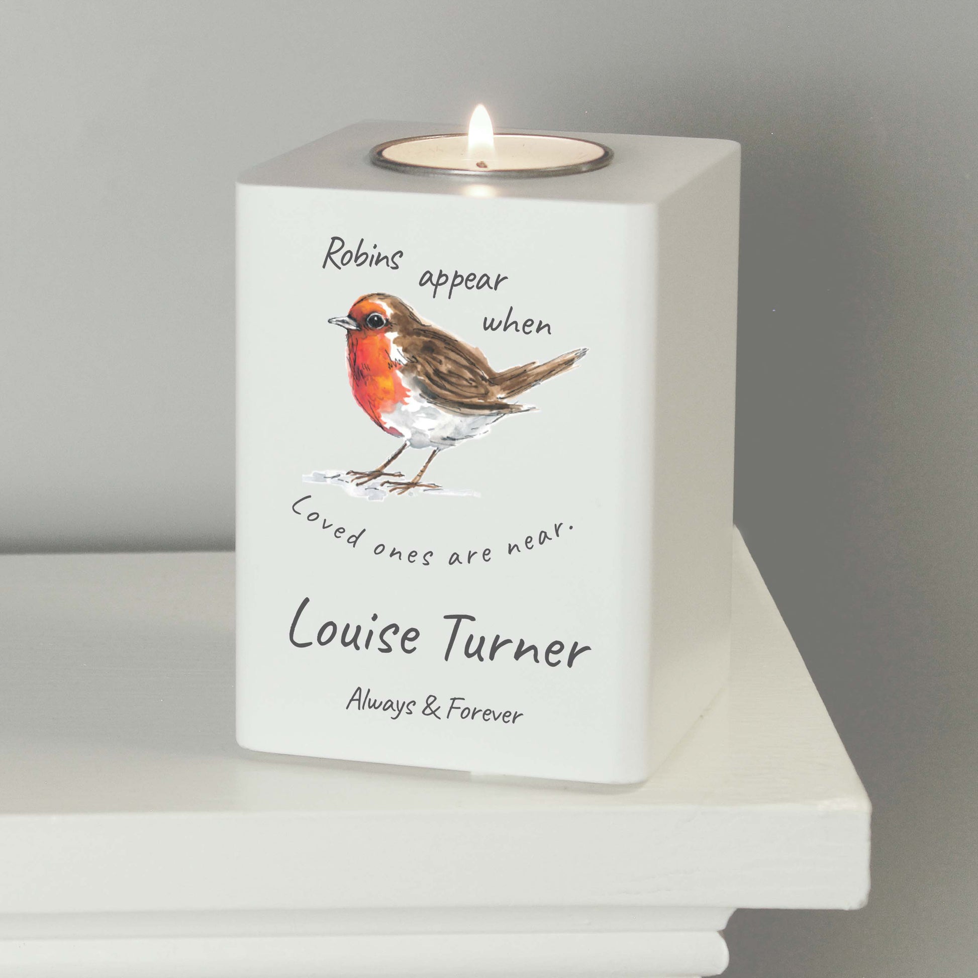 Personalised Robins Appear White Wooden Tea light Holder