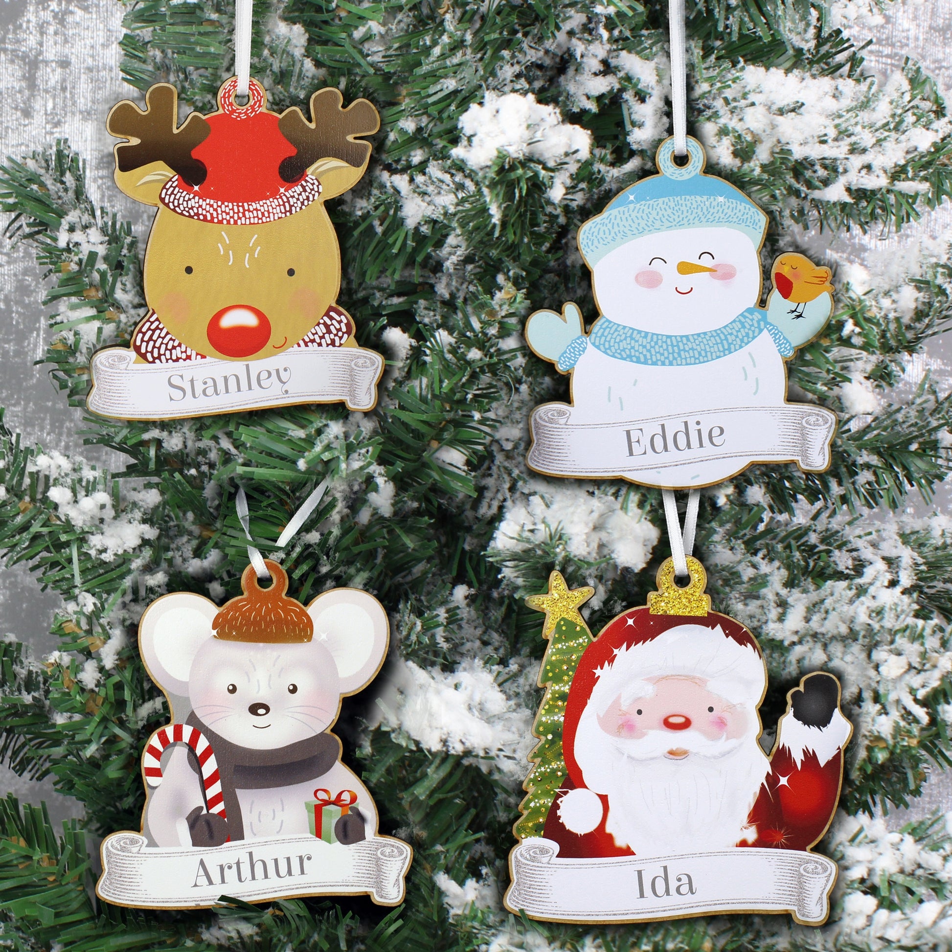 Personalised Set of Four Colourful Christmas Characters Wooden Hanging Decorations