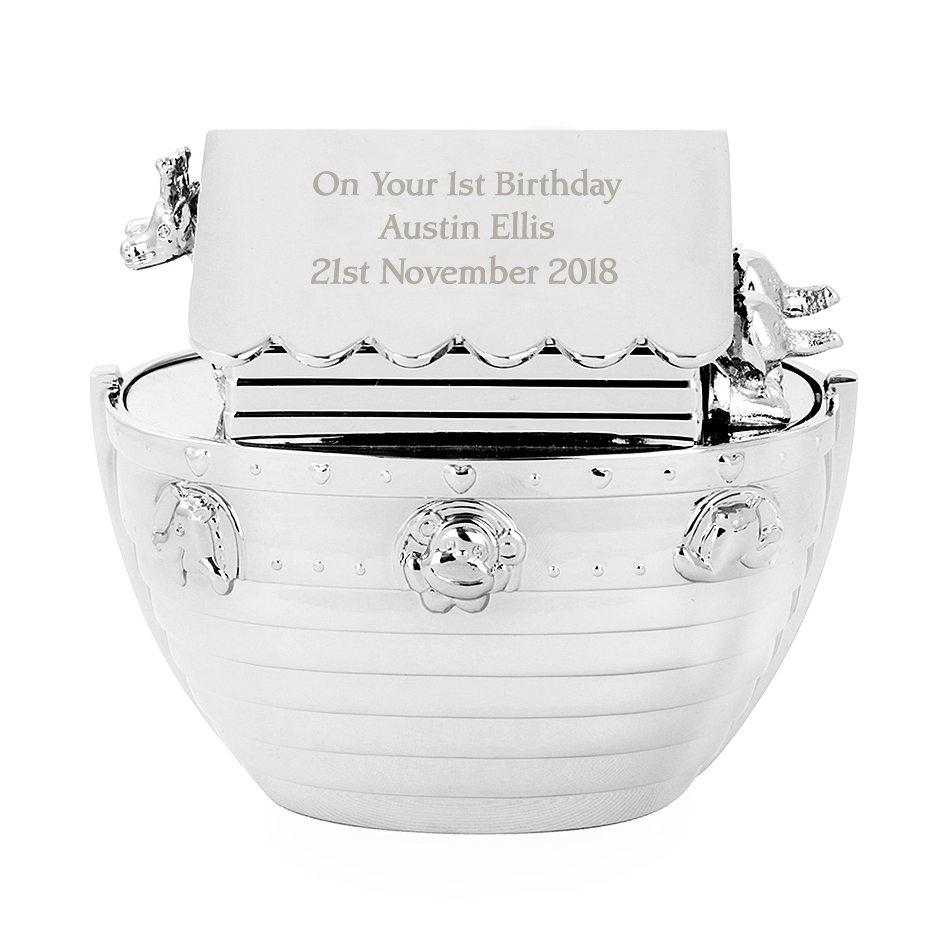 This silver finish Noah's Ark Money Box can be personalised with any message over 3 lines and up to 20 characters per line.