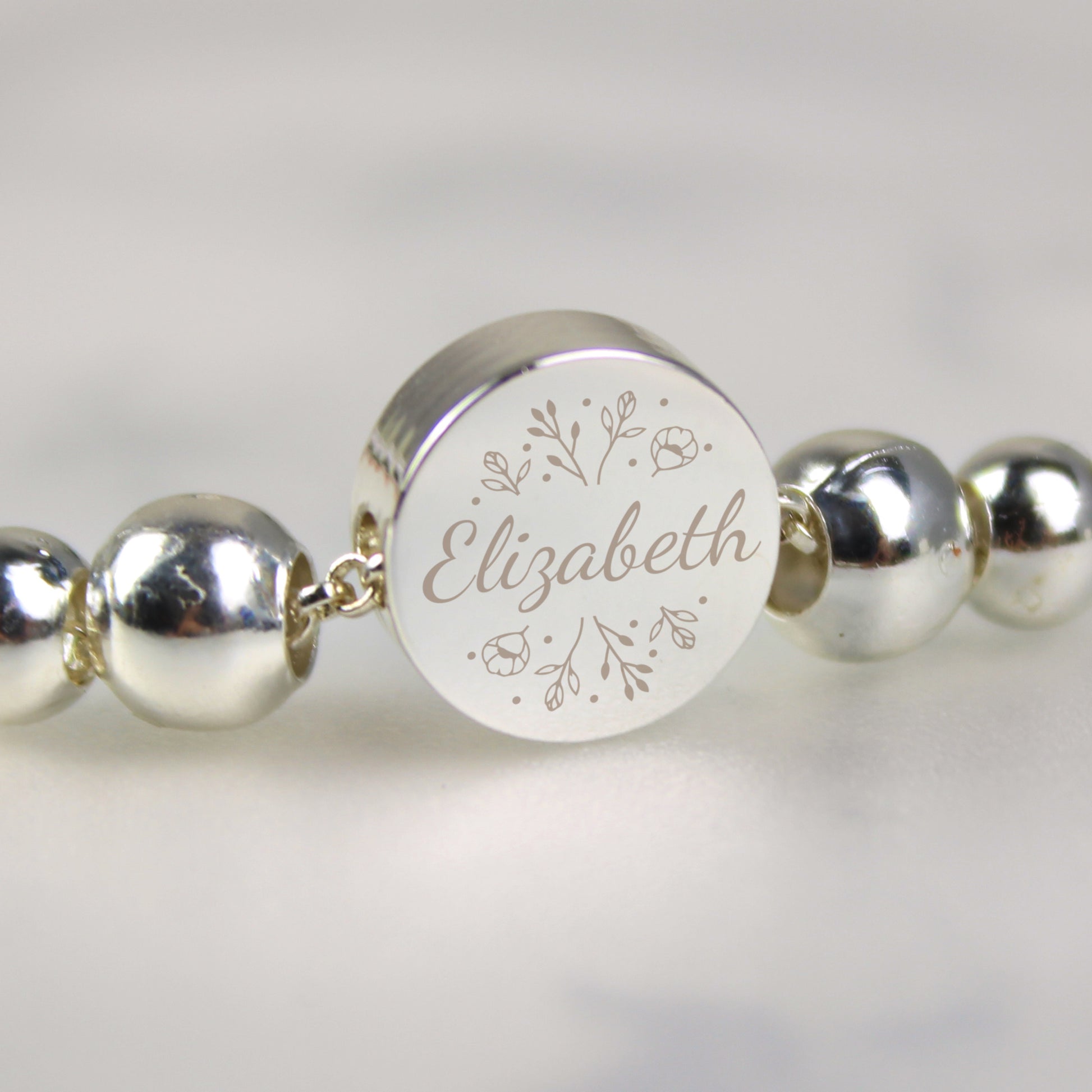 Crafted with a delicate silver-tone finish, this bracelet features a beautifully etched flower disc that can be personalised with a name up to 12 characters