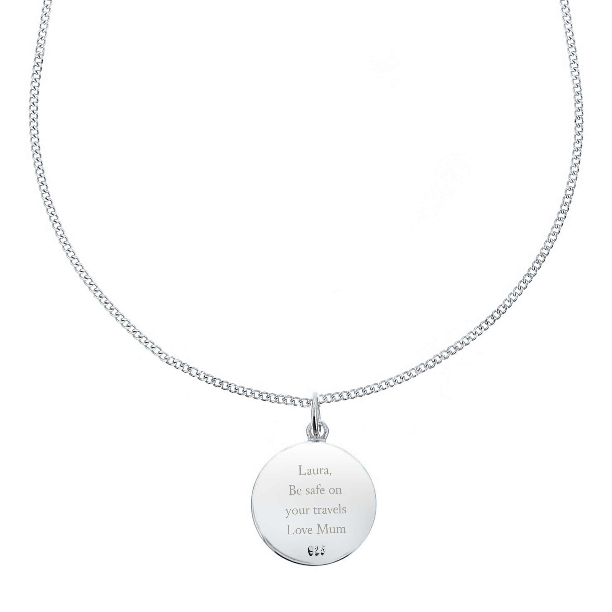 The necklace can be personalised with 4 lines of text. Lines 1 and 4 can be personalised with up to 10 characters each. Lines 2 and 3 can be personalised with 12 characters each.