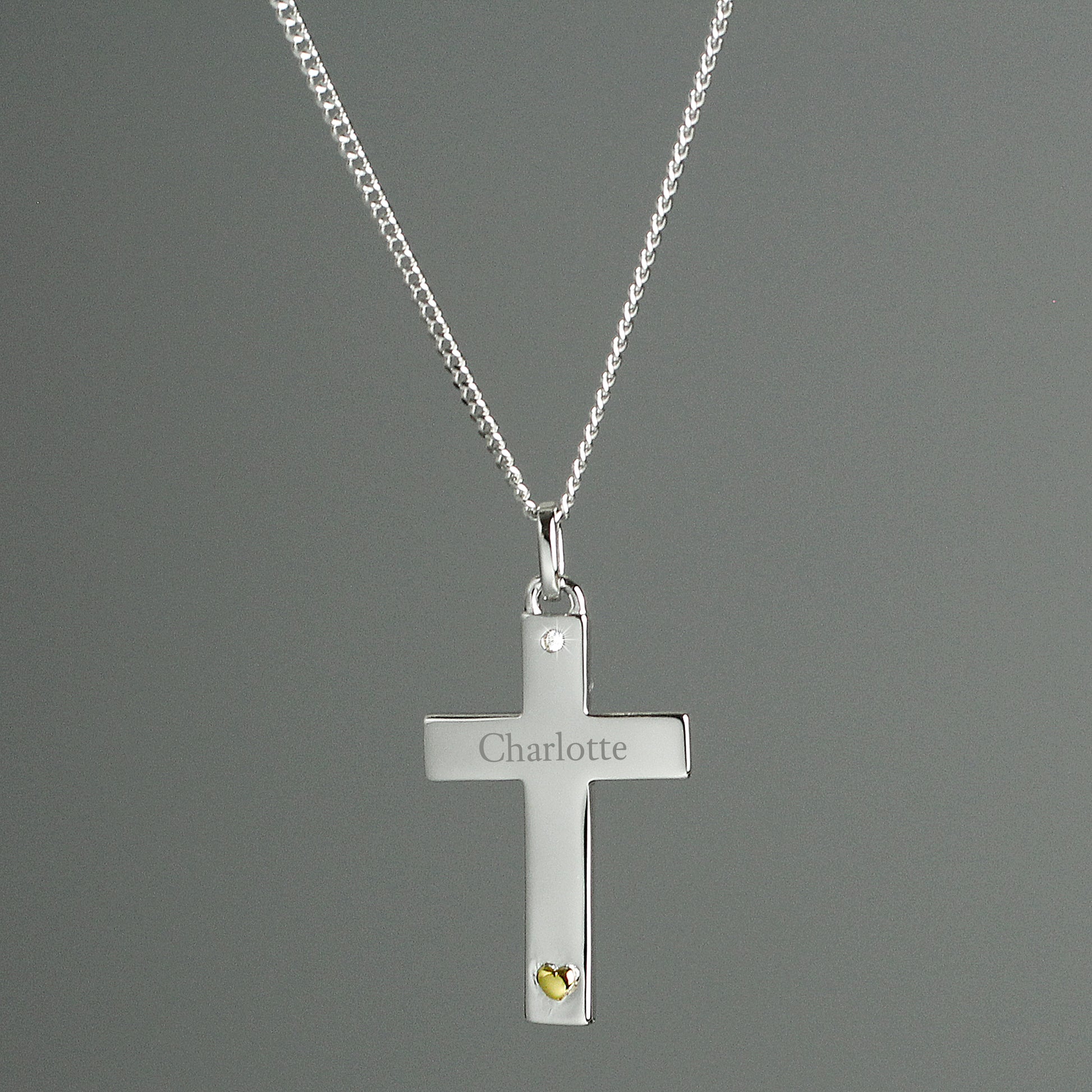Personalised Sterling Silver Cross with 9ct Gold Heart & CZ Necklace