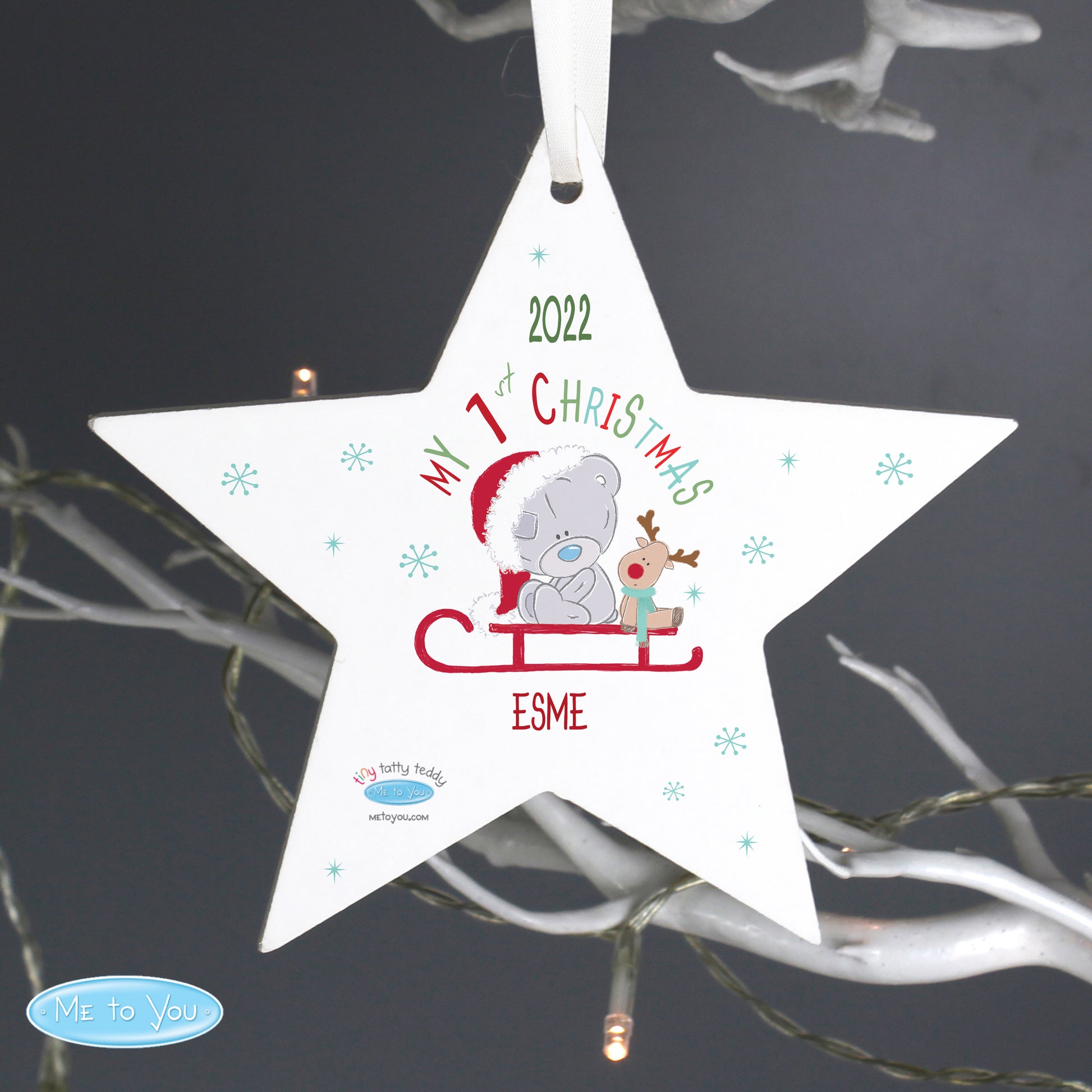 Our Personalised Tiny Tatty Teddy My 1st Christmas Sleigh Wooden Star Decoration is a perfect way to celebrate baby's special first Christmas. It can be hung on the tree or around the house as a stylish Christmas decoration.