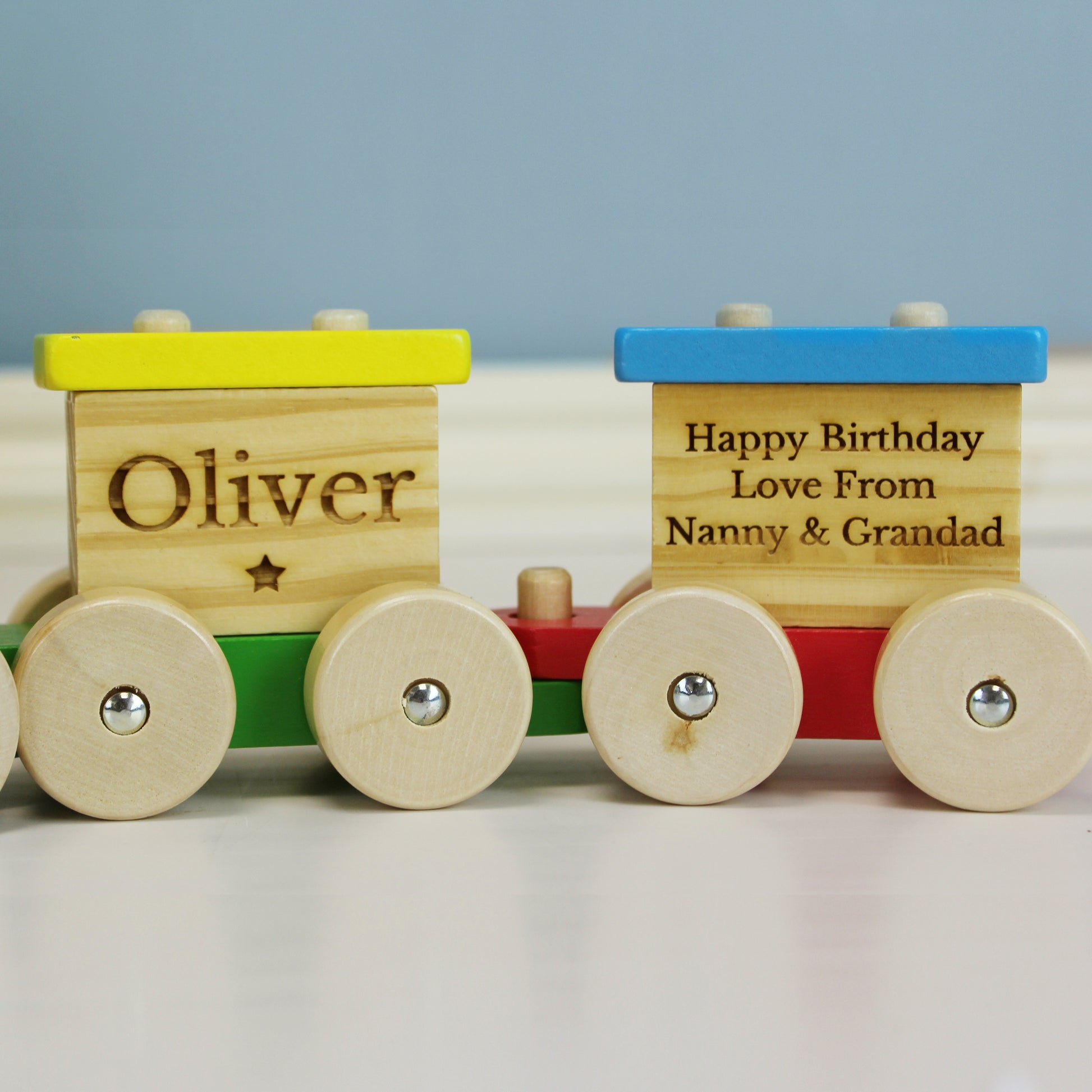 Step right up and witness the magic of the Personalised Wooden Toy Train!